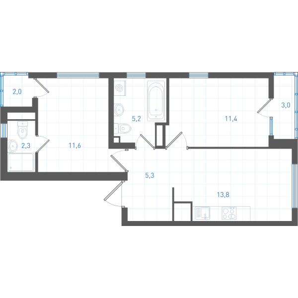 Планировка является типовой. Площади помещений, расположение и размеры венткоробов могут меняться в зависимости от этажа. Уточнение проектных данных в офисе продаж.