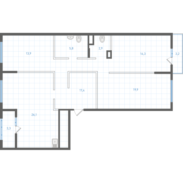 Планировка является типовой. Площади помещений, расположение и размеры венткоробов могут меняться в зависимости от этажа. Уточнение проектных данных в офисе продаж.