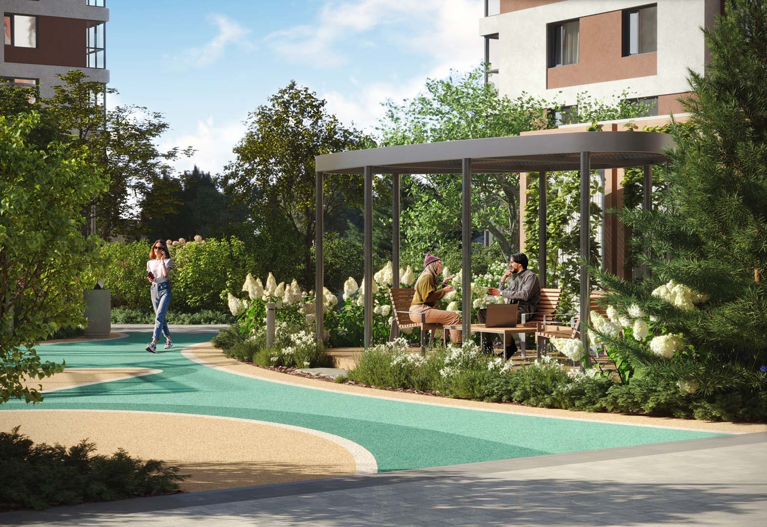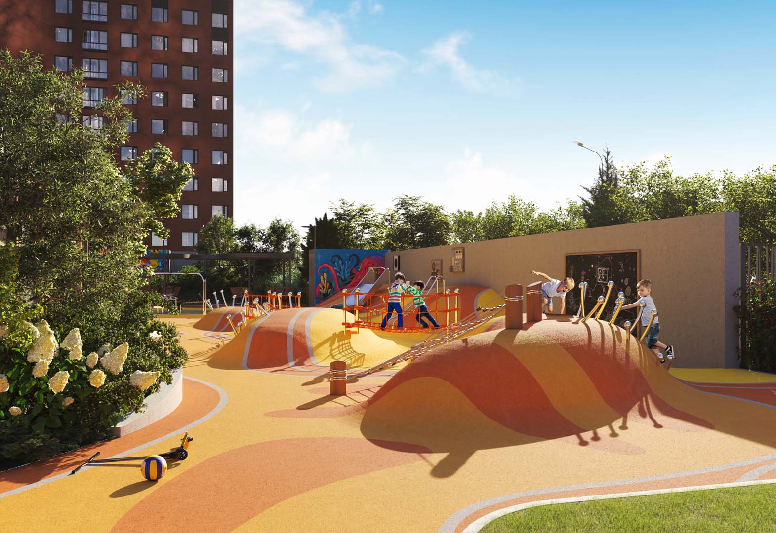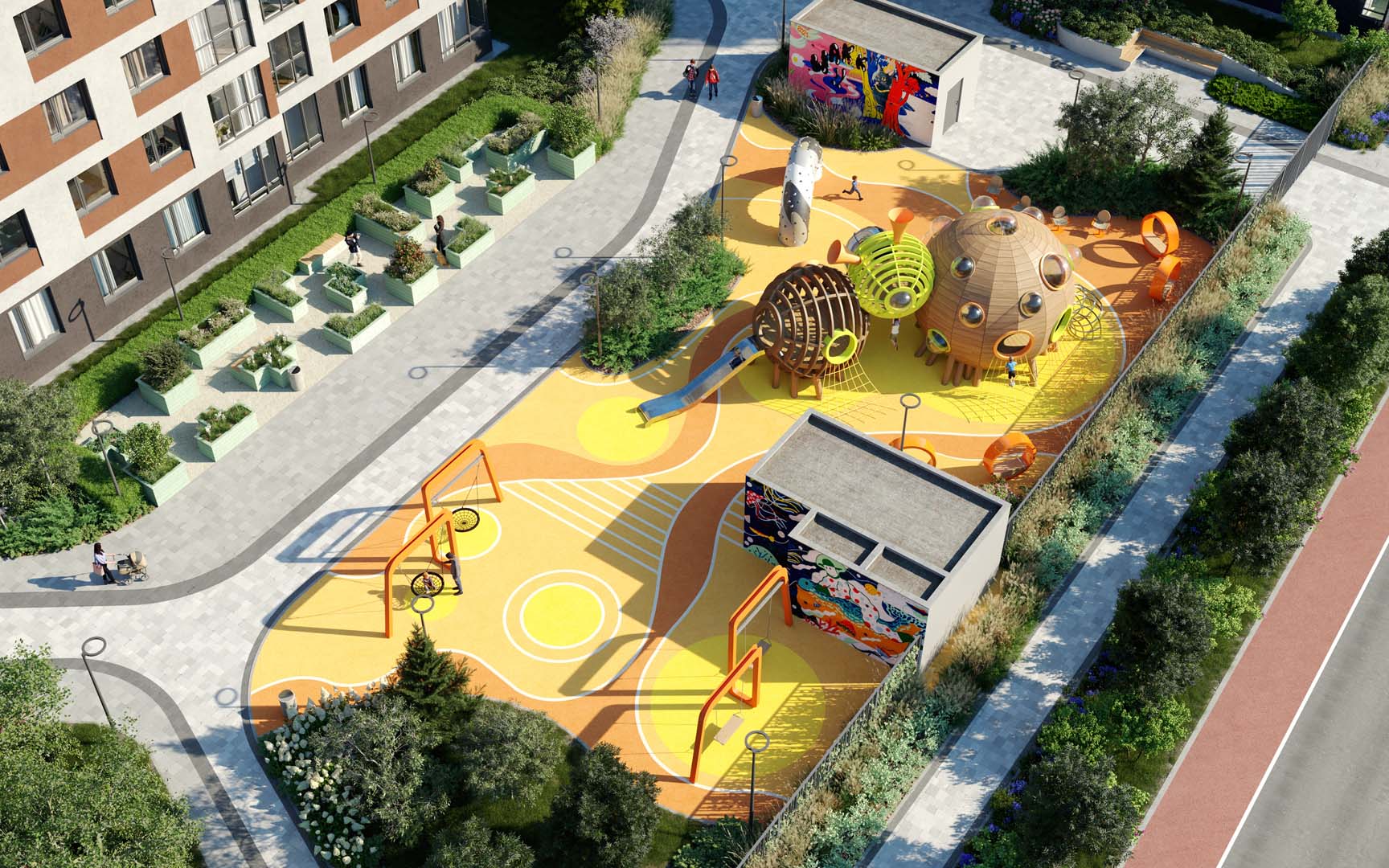 При этом учтены интересы всех жителей – как маленьких, так и взрослых! Разнообразные динамичные площадки для игр, ворк-аут зоны, амфитеатр, площадка для йоги – не только созерцать, но и наслаждаться активным отдыхом!